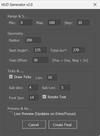 The Advanced HUD Circular Generator v2.0 script eliminates that friction by automating the entire process — complete with live preview, arc control, tick customization, sub-divisions, and dynamic text rotation.