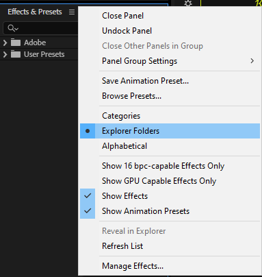 Make sure that you select Explorer Folders from Effects&Presets panel.