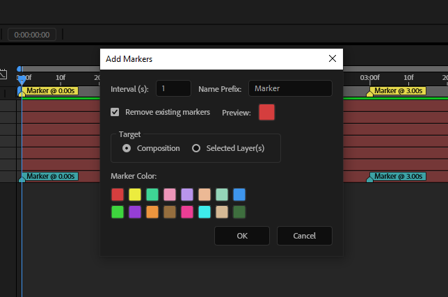 We’ve developed a script, addCompOrLayerMarkers.jsx, that provides a simple dialog box to give you complete control over marker creation. No more manual clicking and naming—just set your parameters, hit “OK,” and let the script do the heavy lifting.