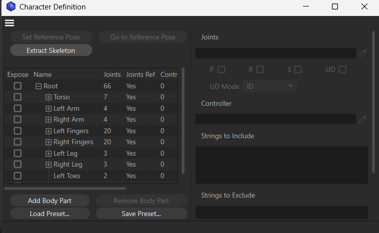 Define the Character: Add a Character Definition Tag to the root joint. Execute the “Extract Skeleton” command, followed by the “Set Reference Pose” command to lock in the T-Pose.