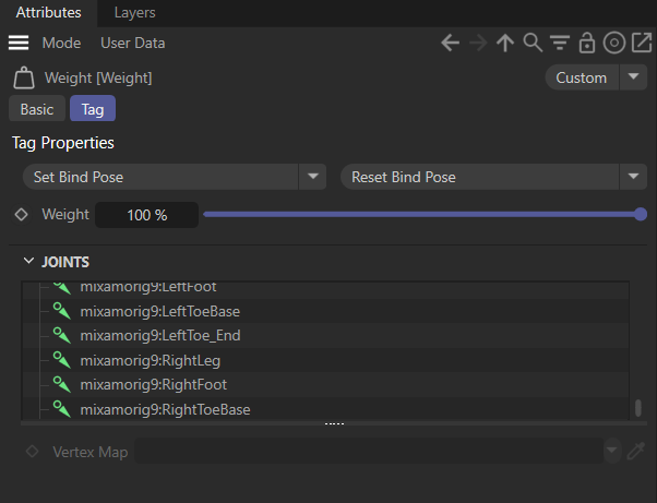 Reset the Bind Pose: Move the playhead to frame 0. Select any Weight Tag on the character’s geometry and click the “Reset Bind Pose” button. This forces the rig into a clean T-Pose.